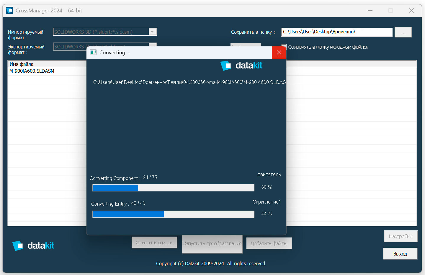 CrossManager — отдельное приложение для конвертации 2D и 3D CAD-файлов без необходимости иметь лицензию исходной CAD-системы. Поддерживает пакетный режим. Платный. CrossManager также доступен как плагин (CrossCad/Plg) для SolidWorks и Rhino, если нужно интегрировать конвертацию прямо в эти CAD-системы.