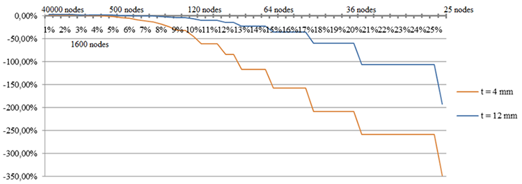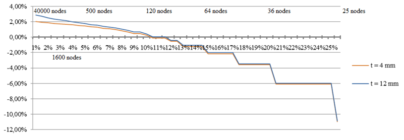 По оси X отложено количество узлов сетки (над осью) и размер КЭ в проценте от наименьшего размера пластины, a (под осью).