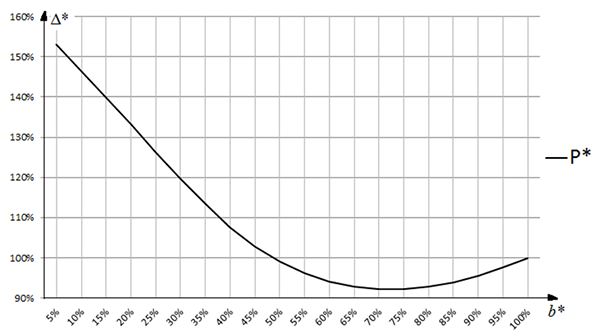 Fig. 12. Изменение критической нагрузки P* в зависимости от длины загруженной кромки, b*.