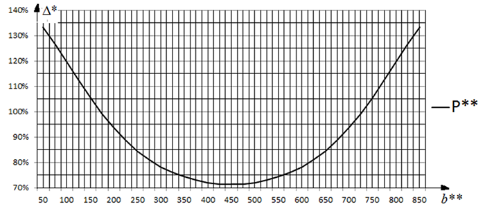Кроме того, что нагрузка на пластину может быть распределена не по всей длине кромки, она также может быть смещена на некоторое расстояние от края пластины, b. На графике представлена зависимость P от зазора b*, при длине загруженной кромки, b = 100 мм. P* представлена в процентах от критической силы пластины, загруженной по всей длине.