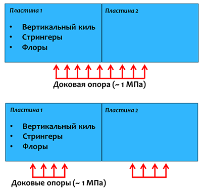 Действительно, при проектировании судна, для обеспечения его общей и местной прочности, в первую очередь учитывают действие тех нагрузок, которые могут встретиться в условиях нормальной эксплуатации (нагрузки от общего изгиба) и порядок которых - 1 МПа. Но давление со стороны доковых опор на порядок выше, т.е. это примерно 10 МПа. Эти усилия воспринимаются днищевым набором судна - вертикальным килем, флорами, стрингерами, представляющие собою, в общем случае, прямоугольные пластины [1].