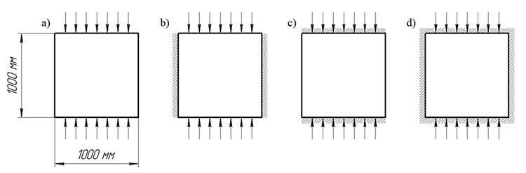 Для оценки влияния условий закрепления пластины на величину критической нагрузки КЭ были выполнены расчеты при различных граничных условиях. На рис. 8 приведены расчетные схемы: a - свободно-опертая по всем кромкам пластина, b – две противоположные кромки свободно оперты, остальные - жестко заделаны, нагрузка приложена к свободно опертым кромкам; c – так же как b, нагрузка приложена к закреплённым кромкам; d – жестко заделанная по всем кромкам пластина.