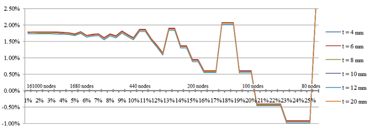 - КЭ сетка. Для определения влияния количества узлов КЭ модели на значение критической нагрузки расчетная область разбивалась с разной густотой сетки. При этом, критическая нагрузка определялась также при толщине пластины от 4 до 12 мм.