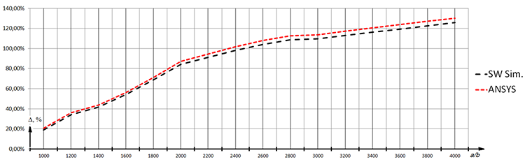 На графиках (рис. 9 и 10) приведены результаты расчетов для квадратной пластины толщиной t = 8 мм. На рис. 9 показаны результаты расчетов с использованием треугольного КЭ 2-го порядка, выполненные в SW Simulation. Результаты расчетов при прямоугольном КЭ 1-го порядка, выполненные в ANSYS показаны на рис. 10.