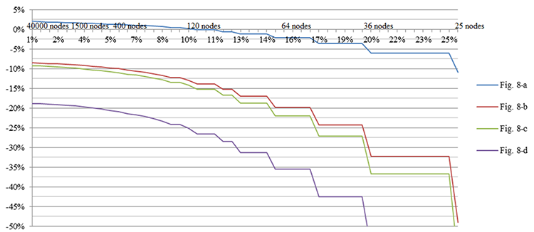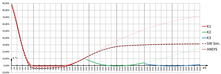На рис. 3, а также на рис. 4 и 5 приведены результаты тестовых расчетов для квадратной пластины (Fig. 2 – a). По оси Y отложена «погрешность» (Δ) значения критической нагрузки полученного по МКЭ в сравнении с аналитическим (справочным) решением: