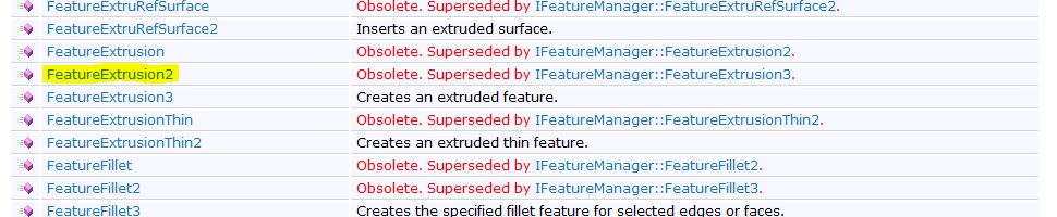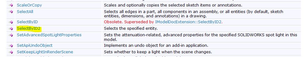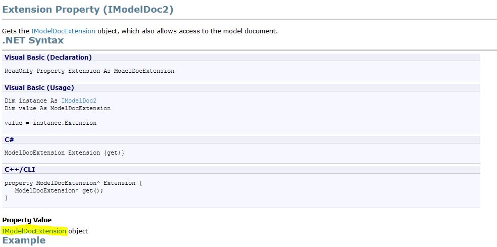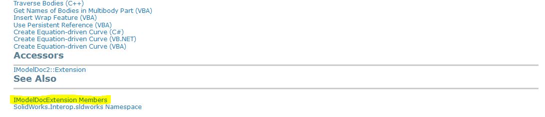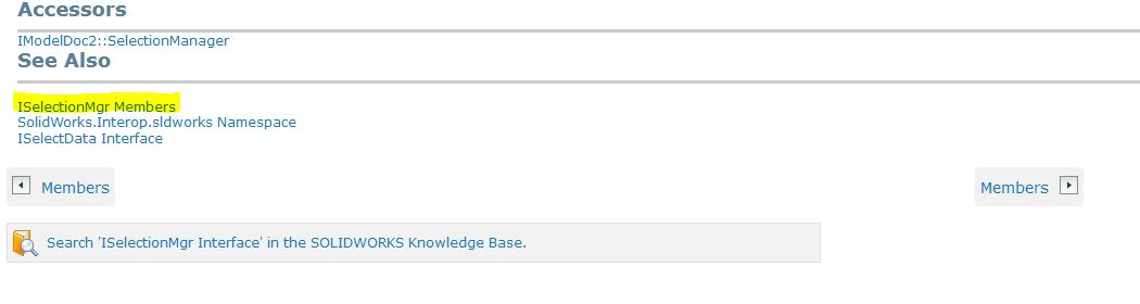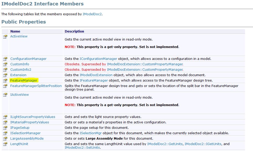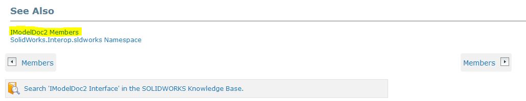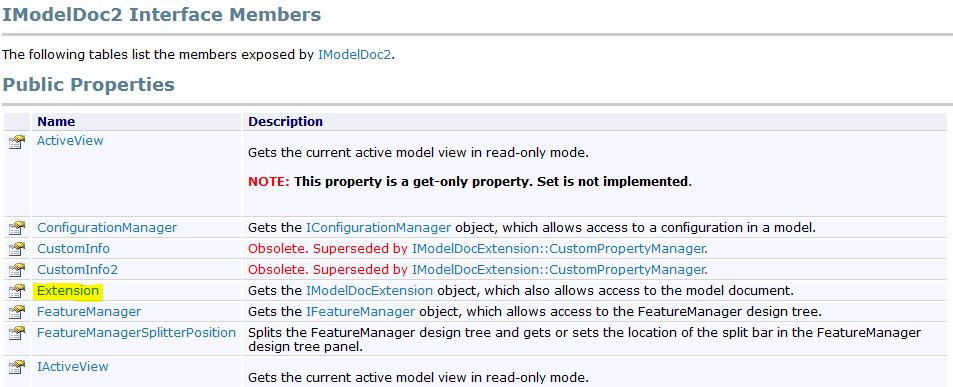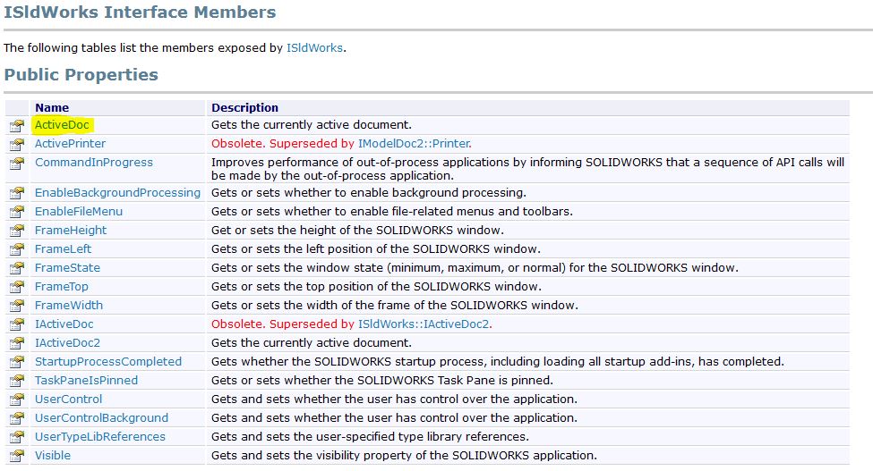 Для этого обратимся к справочной системе SolidWorks API. Она есть в интернете в открытом доступе. Я использовал для работы SolidWorks 2016, поэтому и справку открыл версии 2016. Вам же необходимо использовать справку актуальную для вашей версии SolidWorks. Это важно учитывать, т.к. некоторые интерфейсы, введенные позже, на более ранних версиях SolidWorks не работают.