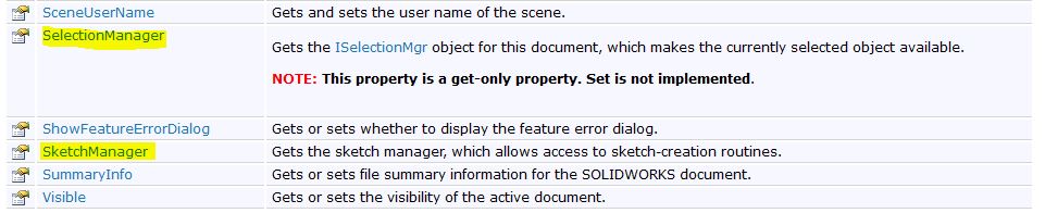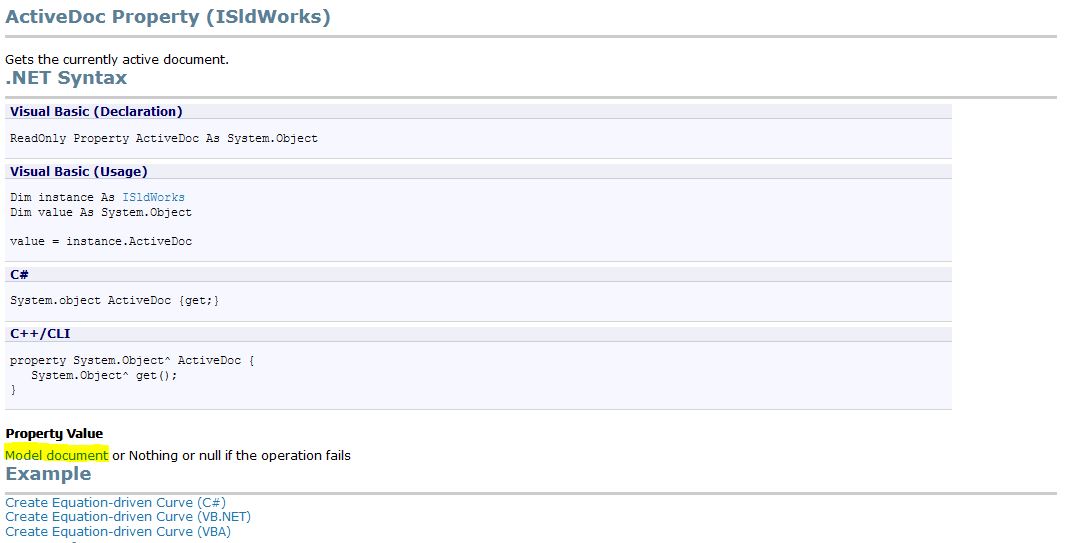 Итак, первым делом нам следует подключиться к активному документу SolidWorks. Для этого в справке вот здесь ищем свойство активного документа