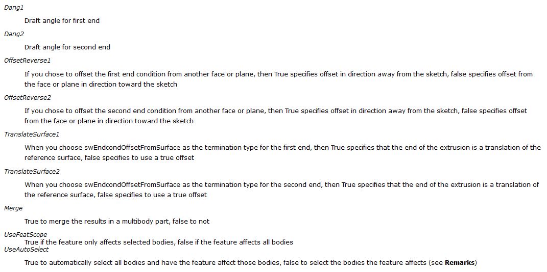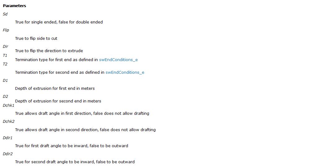 Соответственно, запишем:extrusion = swFeatMgr.FeatureExtrusion2(True, False, False, 0,0,0.02, 0, False, False, False, False, 0, 0, False, False, False, False, True, False, True,0, 0, False)