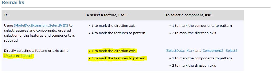 Итак, как же нам правильно выбрать последовательно эти два объекта для создания массива? Для этого пойдём от обратного. Найдём интерфейс кругового массива FeatureCircularPattern4 (можно просто вбить в поисковую строку справки SolidWorks API). Промотав вниз, найдём примечания и увидим, что для выбора элементов нам понадобится интерфейс Select2 . Причём, если мы выбираем элемент, вокруг которого идёт вращение, то аргумент метода будет 1, если выбираем элемент, который множим, то аргумент равен 4.