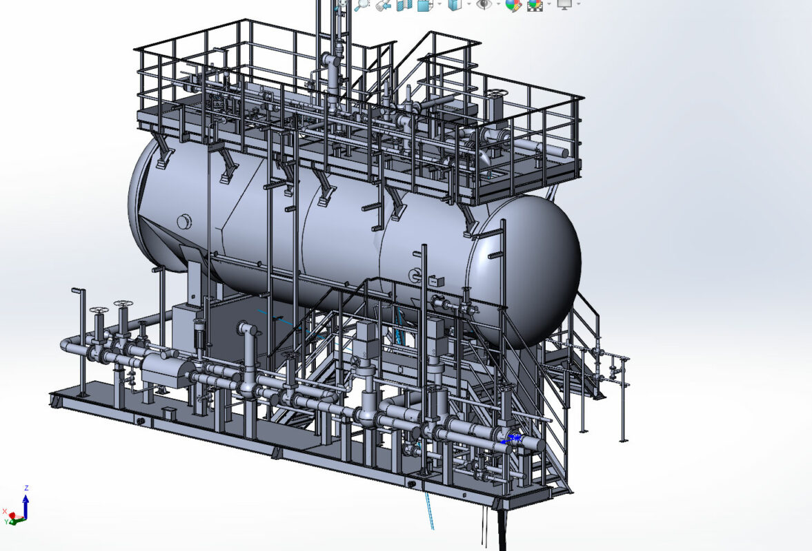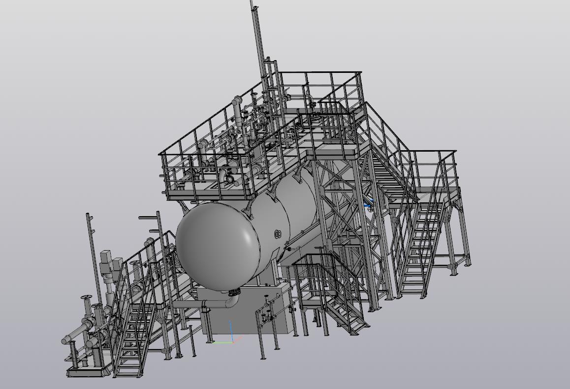Блок дегазации, состоит из горизонтального аппарата, трубопроводов с арматурой, площадок обслуживания, рам и арматурных узлов. Объём емкости 45м3, давление 1МПа, температура рабочей среды 10-32градусов Цельсия. Изначально сделано в AVEVA E3D и сохранено в степ.