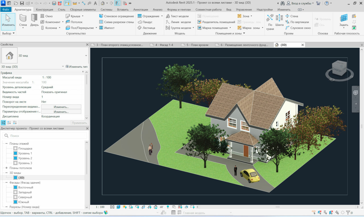 Курсовая работа 1-го курса. В проекте присутствует 3Д визуализация, План дома на всех этажах, разрез и фасады со всех сторон. Общая квадратура дома составляет 127.28 кв.м. Указаны условные обозначения.Проект создавался с целью изучения наших возможностей. Проект представляет собой учебный архитектурный проект без записки.