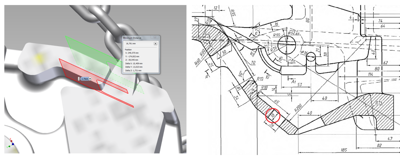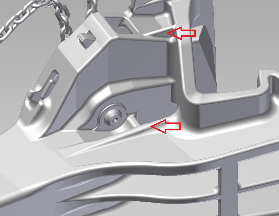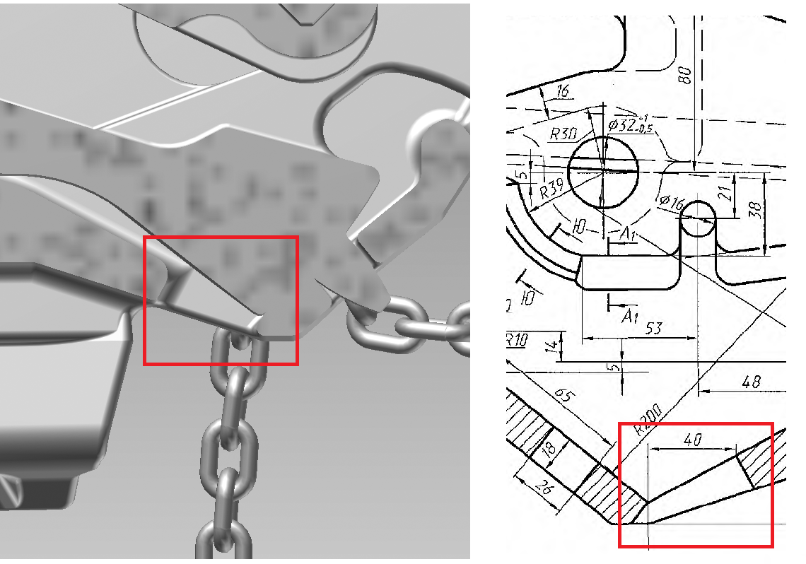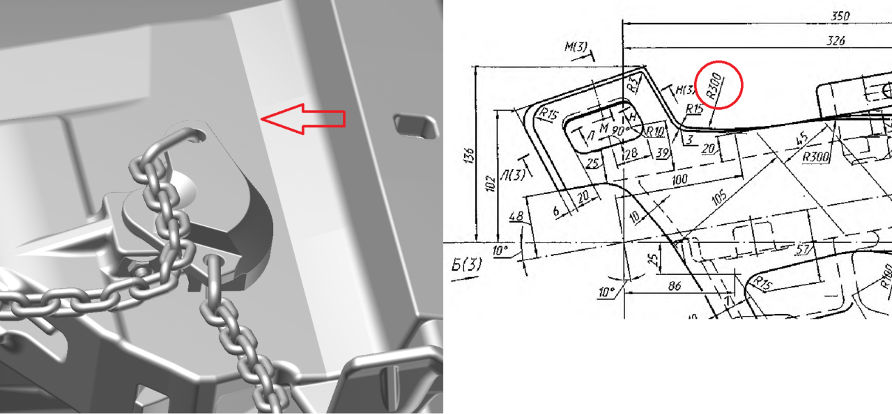 Конструкция автосцепки СА-3 описана в ГОСТ 32885-2014, где представлены детальные ее чертежи и есть прямое указание следовать конструкции и придерживаться размеров. Беглое изучение модели сразу выявило ряд расхождений с ГОСТ, которые показаны на картинках 1, 2 и 3. Особенно досадны просчеты отмеченные на картинках 2 и 3, – неверная геометрия... Кроме того, имеются дополнительные ребра, не являющиеся технологическими, а особенностью конструкции, – см картинку 4. В ГОСТ 32885-2014 эти элементы не отображены...