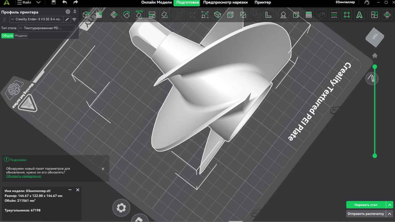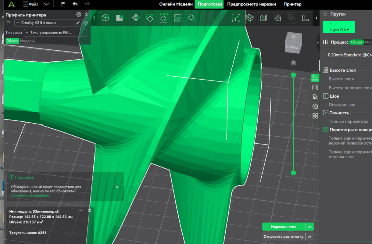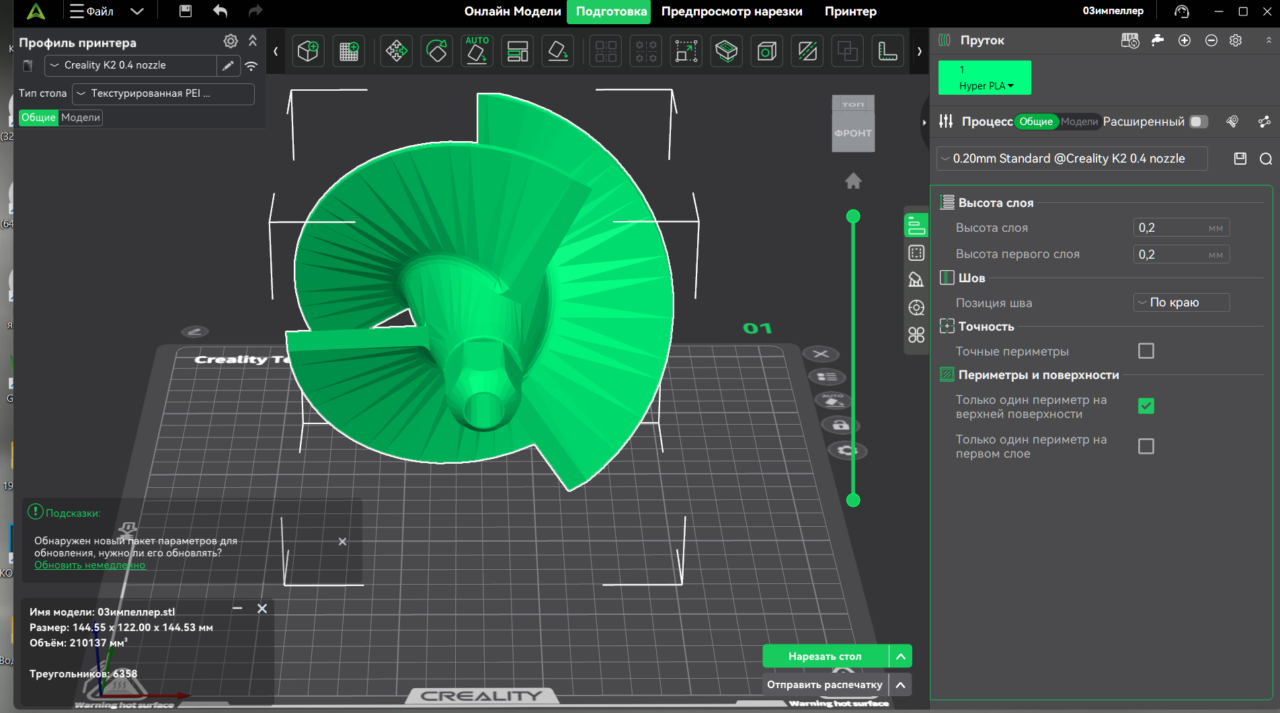 напечатанный импеллер я выбросил, но то что видно на скриншоте печатается тоже самое, то есть эти треугольники на лопостях полностью модель получается рельефная.